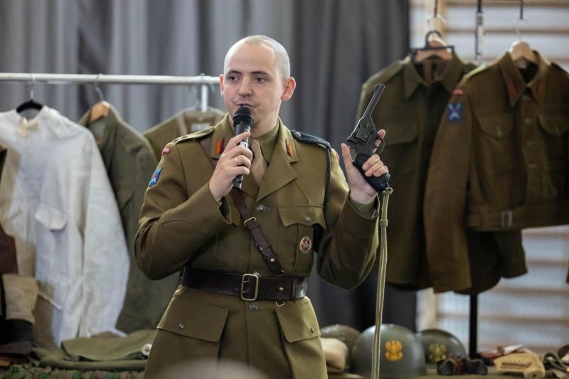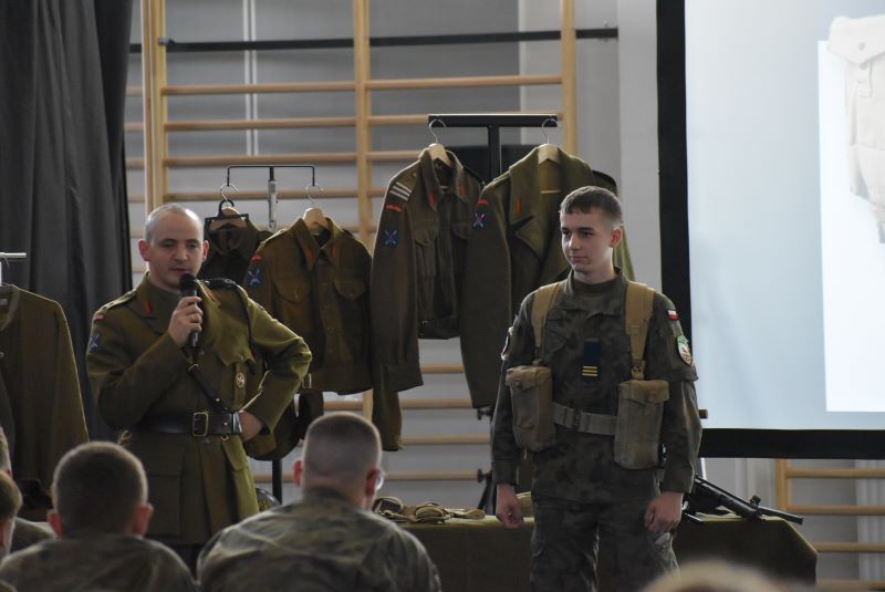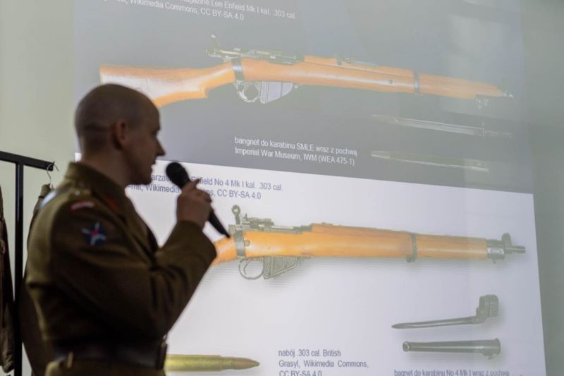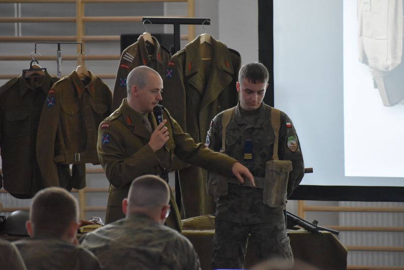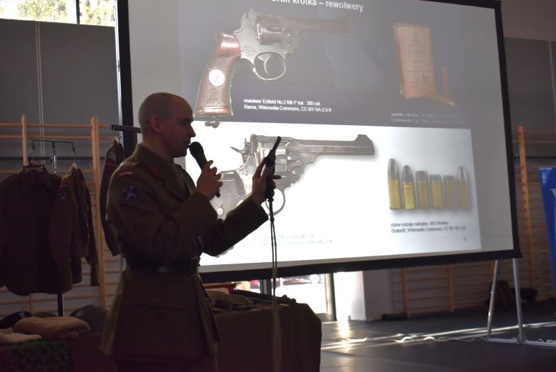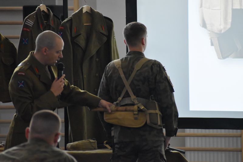Pan Jerzy Dreger poprowadził prelekcję pt. „Umundurowanie, uzbrojenie, wyposażenie i oporządzenie żołnierzy 1. Dywizji Pancernej”, ukazując codzienność, wyposażenie i trud żołnierskiej służby podczas II wojny światowej.