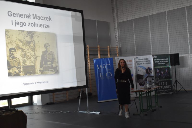 Pani dr Anna Pastorek zaprezentowała wykład pt. „Generał Maczek i jego żołnierze”, przybliżający postać legendarnego dowódcy 1. Dywizji Pancernej oraz jego wkład w walkę o wolność Polski i Europy.