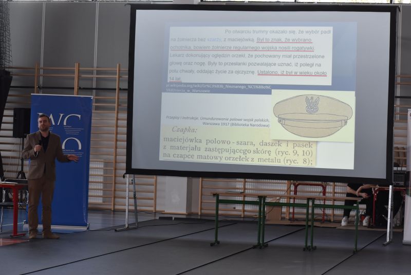 21 kwietnia 2026 r. uczniowie naszej szkoły uczestniczyli w prelekcji Mateusza Napieralskiego pt. „100 lat Grób Nieznanego Żołnierza”. W trakcie wystąpienia przybliżono historię tego wyjątkowego miejsca pamięci narodowej, okoliczności jego powstania oraz znaczenie, jakie pełni ono we współczesnej świadomości społecznej. Szczególną uwagę poświęcono symbolice Grobu Nieznanego Żołnierza jako wyrazu hołdu dla wszystkich poległych w obronie ojczyzny, których tożsamość pozostała nieznana.