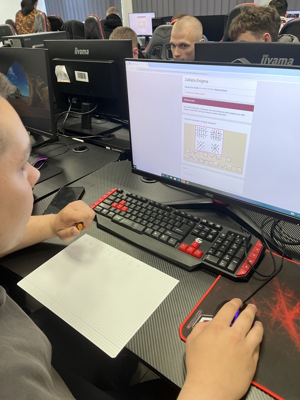 Klasa 3OPb wraz z panią Joanną Marzec podjęła wyzwanie przejścia przez escape room „Zaklęta Enigma”, łączący naukę z zabawą, angażującą fabułą oraz serią logicznych zagadek, łamigłówek i zadań manualnych. Pokój zagadek zaangażował do pracy nawet najbardziej opornych kadetów. Uczniowie klasy V TL pod opieką pani Kamili Borczon mieli za zadanie odszyfrować dwa hasła, które zostały zapisane za pomocą symboli. Aby otrzymać „klucz” musieli podać czterocyfrowy kod, do odczytania którego prowadziły cztery nietypowe zadania matematyczne. Pojawił się między innymi labirynt z logarytmami, zadanie do odczytania treści, którego należało wykorzystać lustrzane odbicie, czy też „Piotruś” w wersji skróconej. Tylko prawidłowe rozwiązanie poszczególnych etapów zadań przybliżało graczy do odgadnięcia poszukiwanego kodu. Zwycięska grupa otrzymała jeszcze dodatkowe hasła do odkodowania. W tym celu uczniowie musieli wykorzystać tablicę Polibiusza oraz złamać szyfr ułamkowy. Z pewnością była to lekcja pełna zabawy, zdrowej rywalizacji, ucząca pracy zespołowej i dająca poczucie przynależności do grupy.