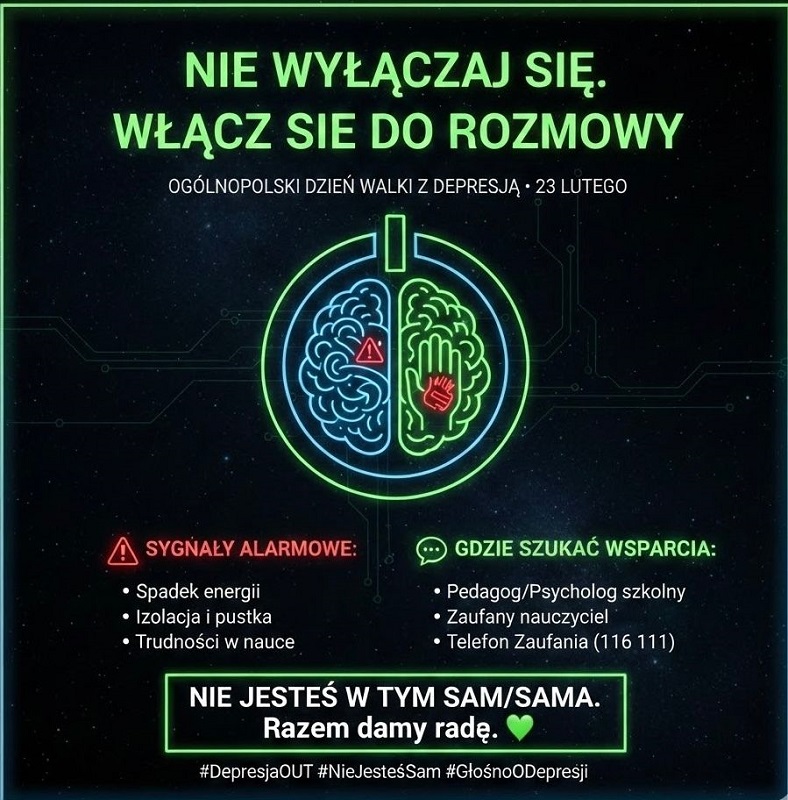Jako Samorząd Uczniowski nie jesteśmy tu tylko od organizowania „szczęśliwych numerków” czy dni bez pytania. Jesteśmy tu dla Was. 23 lutego obchodziliśmy Ogólnopolski Dzień Walki z Depresją.
