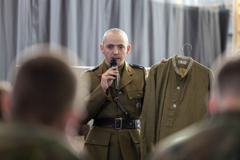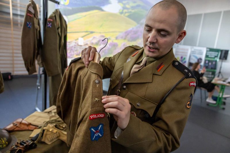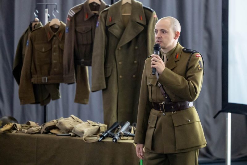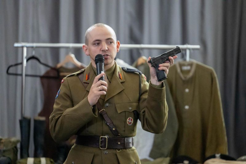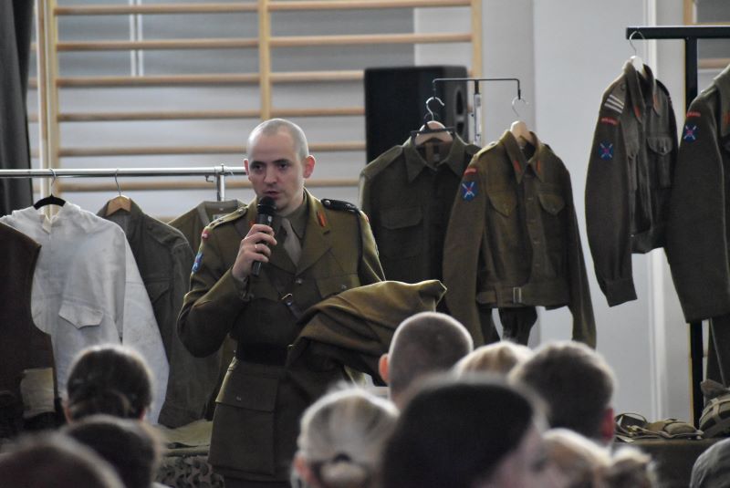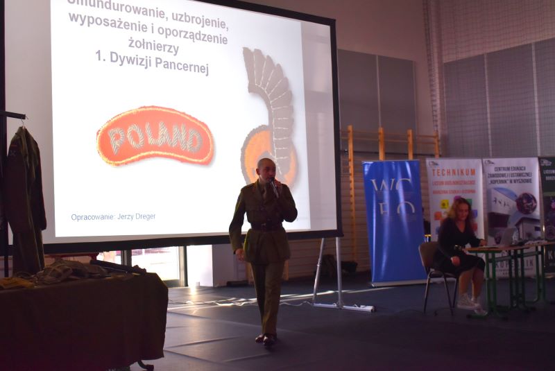 Pan Jerzy Dreger poprowadził prelekcję pt. „Umundurowanie, uzbrojenie, wyposażenie i oporządzenie żołnierzy 1. Dywizji Pancernej”, ukazując codzienność, wyposażenie i trud żołnierskiej służby podczas II wojny światowej.