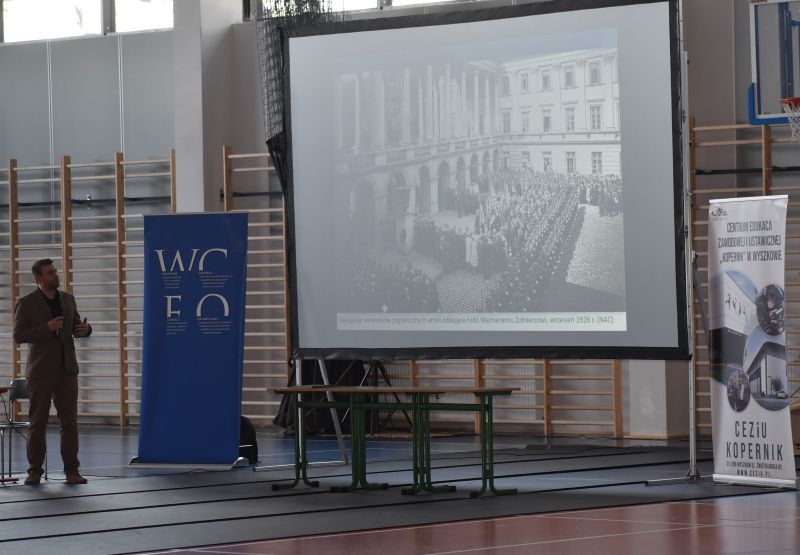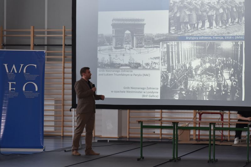 21 kwietnia 2026 r. uczniowie naszej szkoły uczestniczyli w prelekcji Mateusza Napieralskiego pt. „100 lat Grób Nieznanego Żołnierza”. W trakcie wystąpienia przybliżono historię tego wyjątkowego miejsca pamięci narodowej, okoliczności jego powstania oraz znaczenie, jakie pełni ono we współczesnej świadomości społecznej. Szczególną uwagę poświęcono symbolice Grobu Nieznanego Żołnierza jako wyrazu hołdu dla wszystkich poległych w obronie ojczyzny, których tożsamość pozostała nieznana.