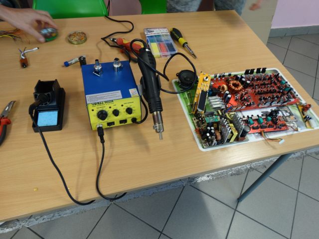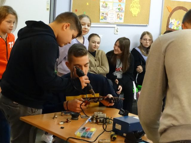 W dniu 25.11.2022r. uczniowie CEZiU „Kopernik” z klasy IV TEp – Patryk Jastrzębski i Dawid Piątek przeprowadzili w Szkole Podstawowej im. Ks. Jana Trzaskomy w Porządziu lekcję z obsługi stacji lutowniczej z kolbą gorącego powietrza. Najpierw omówili młodszym słuchaczom budowę stacji i wyjaśnili do czego ona służy, a następnie zademonstrowali jej użycie do odlutowywania elementów oraz do ich lutowania. Uczniowie klas V, VI i VII Szkoły Podstawowej bardzo chętnie chłonęli wiedzę i obserwowali jej zastosowanie w praktyce. Z dużym zaangażowaniem pod bacznym okiem starszych kolegów sami lutowali i oceniali efekty swojej pracy.