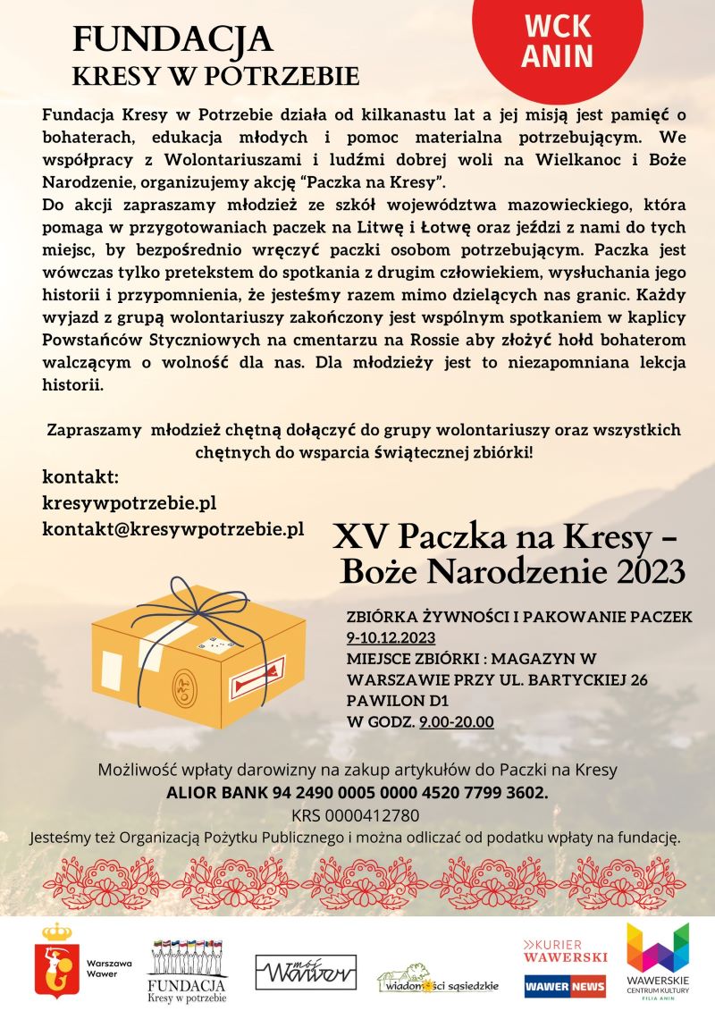Nasza szkoła od wielu lat angażuje się w różne akcje, które wspierają, pomagają i pamiętają o osobach, które potrzebują pomocy. W tym roku organizujemy kolejną akcję charytatywną pod hasłem: „Paczka na Kresy” wspierając naszych Rodaków tuż przed Świętami Bożego Narodzenia. Zwracamy się do Was licząc na wsparcie i zaangażowanie w zbiórce produktów żywnościowych takich jak: herbata, kawa, oleje, kasze, ryż, makarony, konserwy i słodycze. Zbiórka darów rusza już 20 listopada 2023 i trwać będzie do 6 grudnia 2023.