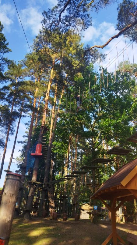 Naszą wycieczkę rozpoczęliśmy od zwiedzania miasta z przewodnikiem. Widzieliśmy Starą Pocztę z Parkiem Muzycznym, Śluzę Augustów na Kanale Augustowskim, Port Żeglugi Augustowskiej, Rynek Zygmunta Augusta z Kolumną Zygmunta II Augusta. Spacerując augustowskim bulwarem dotarliśmy do mola radiowej Trójki, które jest drugim co do wielkości pomostem w Polsce. Rozciąga się ono wzdłuż brzegu na 147 metrów i oferuje cztery podświetlane kąpieliska. Popołudnie spędziliśmy w parku linowym, wędrując w koronach drzew i podziwiając widok na Jezioro Necko.