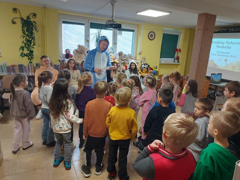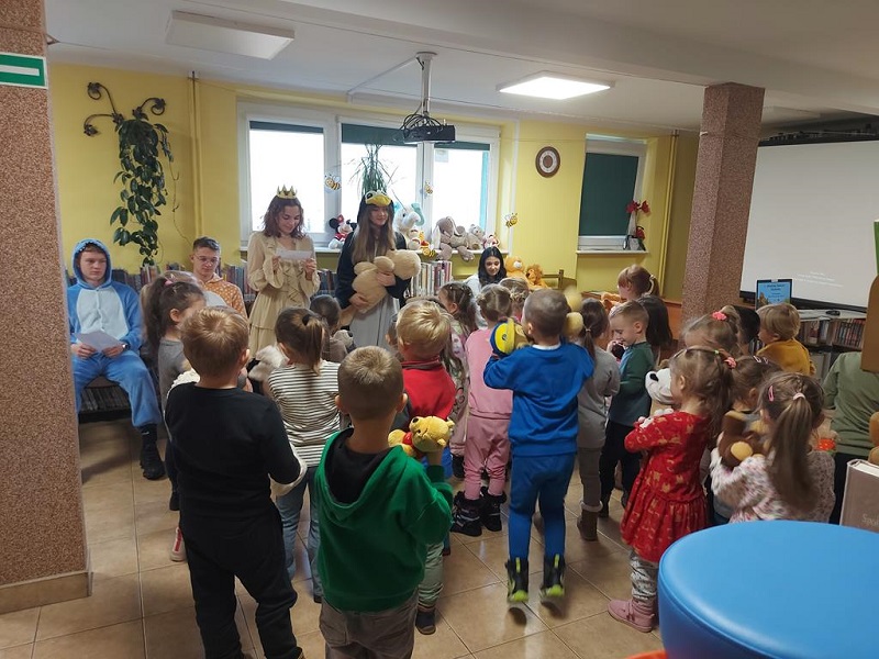Uczniowie przebrani za postacie z bajek uatrakcyjnili Misiowe spotkanie. Podczas urodzin Pluszowego Misia wolontariusze czytali maluchom bajki, rozwiązywali zagadki oraz zachęcali do wspólnej zabawy.