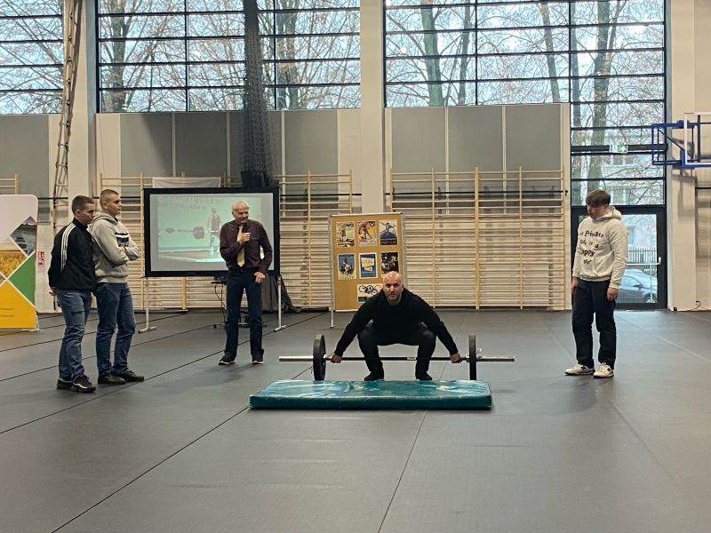 Symboliczne gesty wprowadziły atmosferę olimpijskiego ducha, przypominając wszystkim o ideach takich jak fair play, wytrwałość i dążenie do doskonałości. Scena ta była pięknym wstępem do dalszej części wydarzenia. Spotkanie prowadził Pan Andrzej Rembowski, a uroczystego przywitania gościa dokonała dyrektor szkoły Pani Monika Kluczek. Olimpijczyk opowiedział o swojej drodze do sukcesu, począwszy od pierwszych treningów aż po udział w zawodach najwyższej rangi. W trakcie spotkania odbyła się mini konferencja prasowa, podczas której uczniowie Łukasz Kluczek (3 OPW) oraz Tomasz Jakubczyk (3 TE) zadawali pytania olimpijczykowi. Rozmowa dostarczyła wielu inspirujących informacji o karierze olimpijskiej, przygotowaniach do zawodów oraz wyzwaniach, z jakimi zmaga się sportowiec tej rangi. Marcin Dołęga z pasją i autentycznością odpowiadał na pytania, podkreślając, że kluczem do sukcesu jest nie tylko ciężka praca, ale także wytrwałość i umiejętność wyciągania wniosków z każdej porażki. Ciekawym elementem spotkania dla zgromadzonych na trybunach gości była możliwość obejrzenia i dotknięcia brązowego medalu olimpijskiego z Pekinu zdobytego w 2008 roku. Nie obyło się również bez prezentacja podnoszenia sztangi w wykonaniu przybyłego gościa. Uczestnicy mieli okazję podziwiać technikę i umiejętności mistrza. Na zakończenie spotkania Dyrekcja wręczyła drobny upominek w podziękowaniu za wizytę. Marcin Dołęga zachęcił młodzież do rozwijania swoich pasji i marzeń, niezależnie od napotykanych trudności. Spotkanie było inspirującym doświadczeniem, które na długo pozostanie w pamięci całej społeczności szkolnej. Przyniosło ono nie tylko wiedzę na temat sportu i olimpizmu, ale także zmotywowało uczniów do pracy nad sobą i dążenia do wyznaczonych celów.